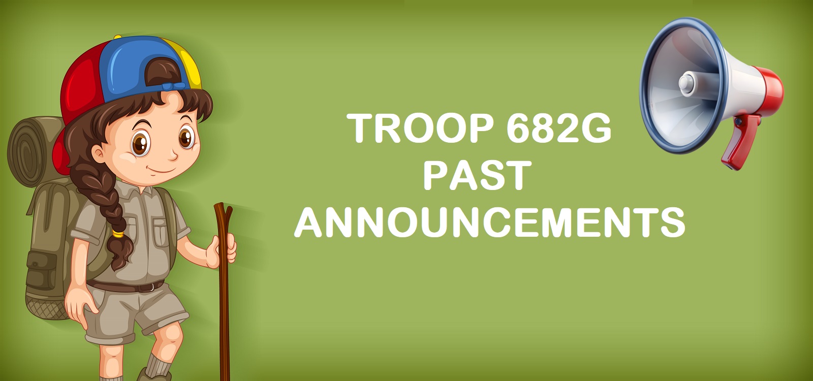 A few troop 682 announcements are below. Please note that the Honey Badger patrol is the April service patrol, and the Koala patrol is the April program patrol. Also, please note the April 11 new scout parents meeting.